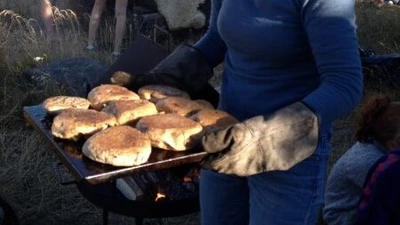 Billede af pandekager der bages over bål
