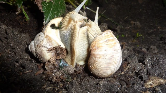 Sneglene indleder deres parring med at cirkle rundt om hinanden. Det foregår ofte højt oppe i et træ eller på en væg – og så sker det om natten.